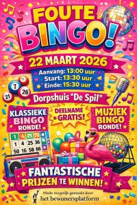 - Foute BINGO !!Kom jij 22 maart gezellig met ons bingo’en? We zullen de bekende, klassieke bingo spelen maar ook een foute muziekbingo! Trek je meest foute…